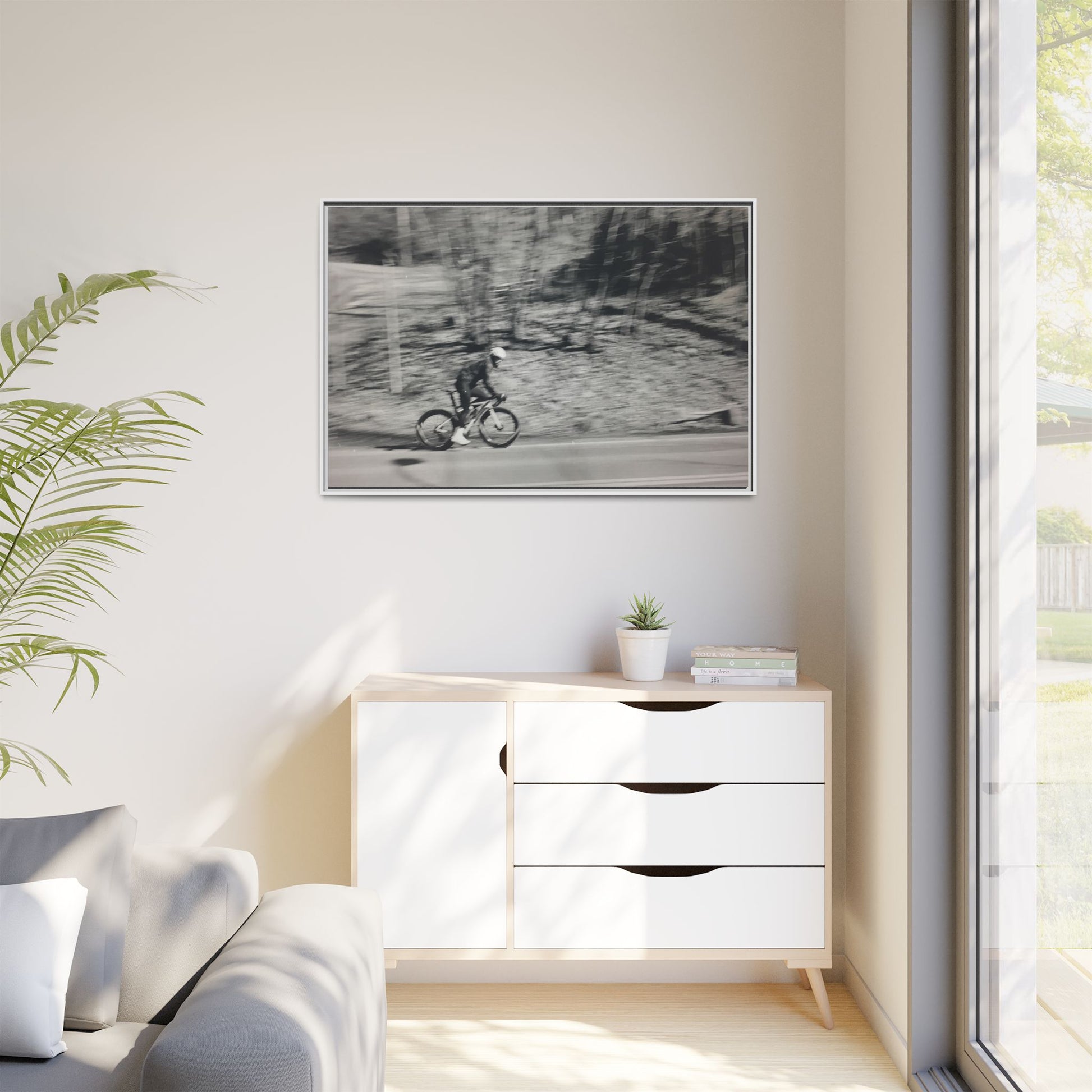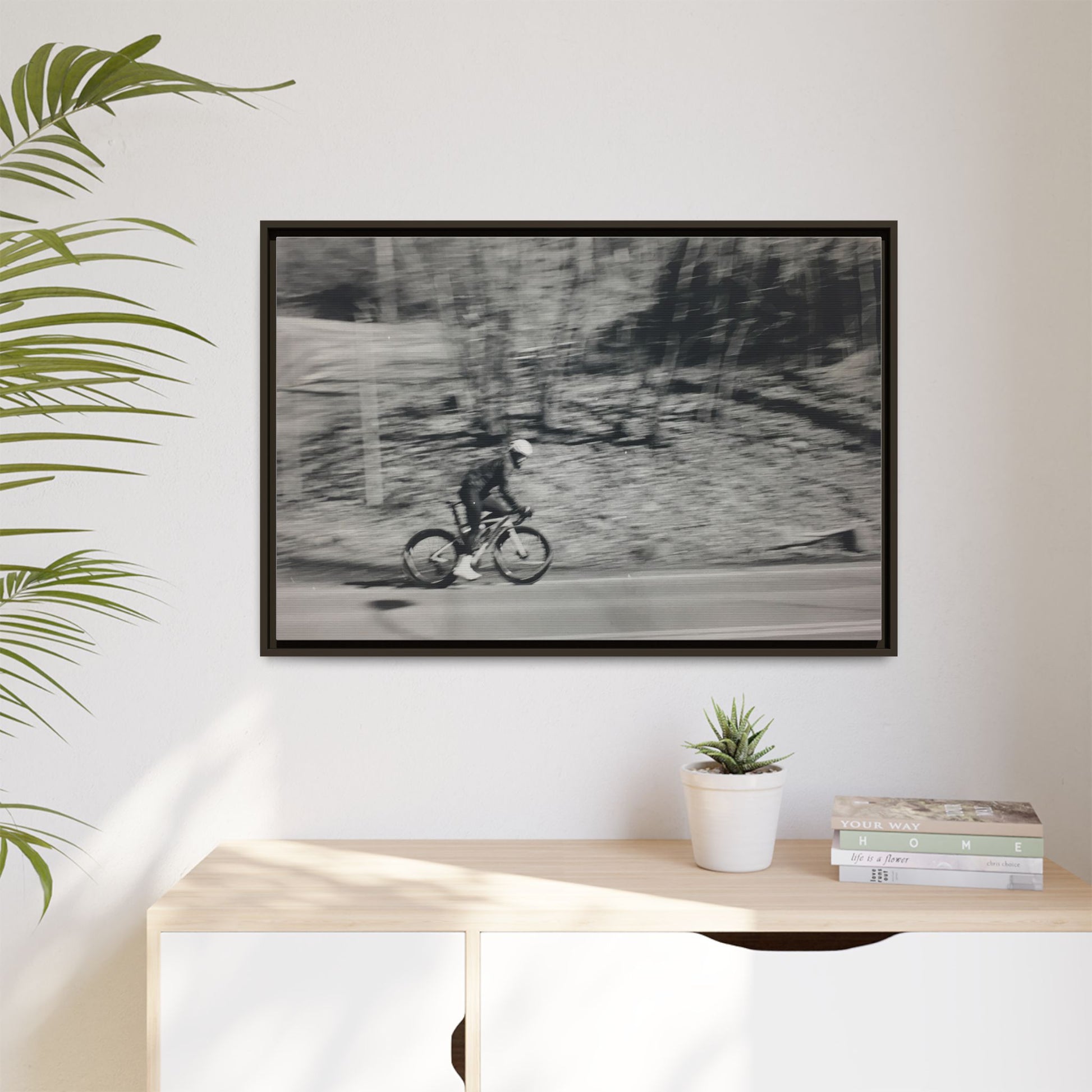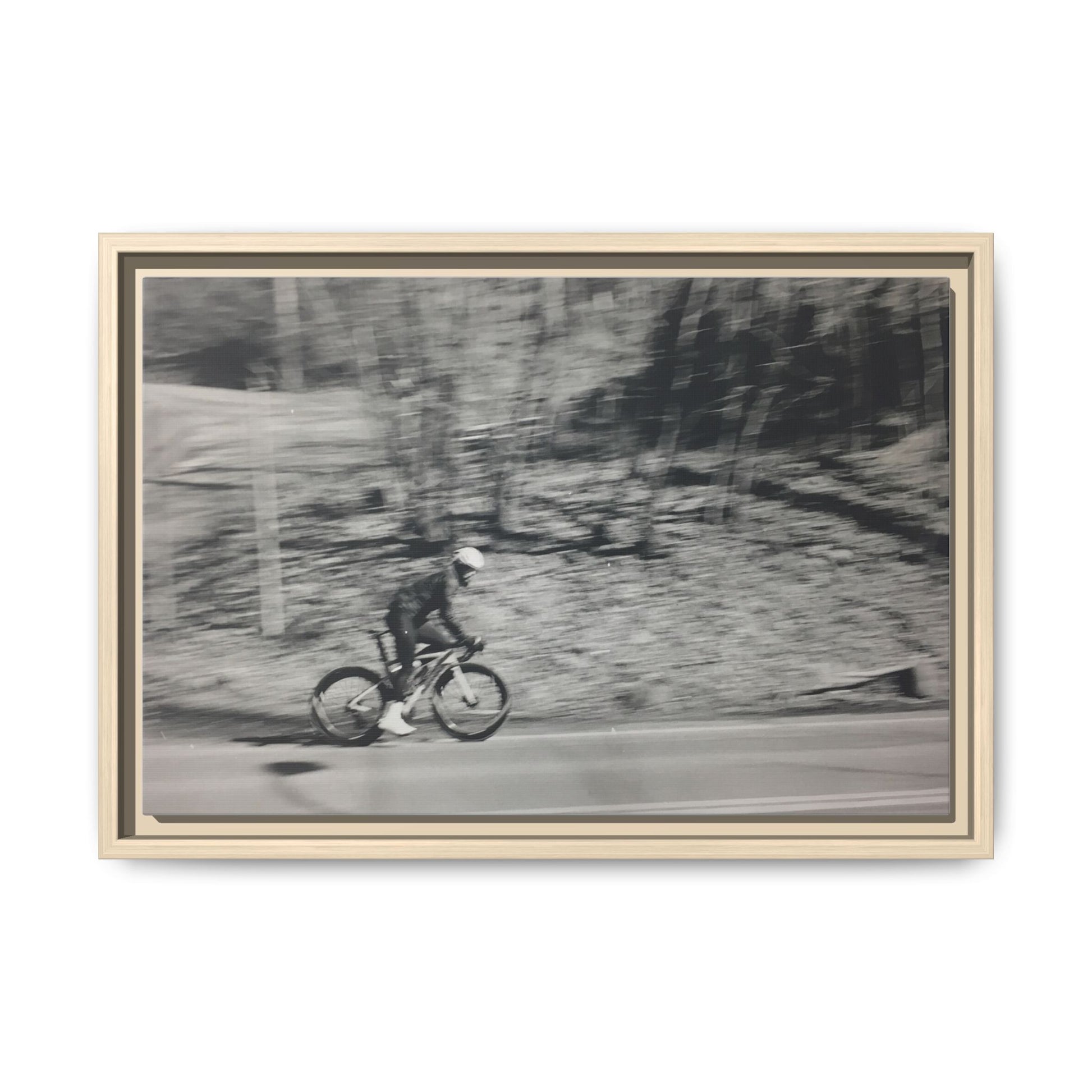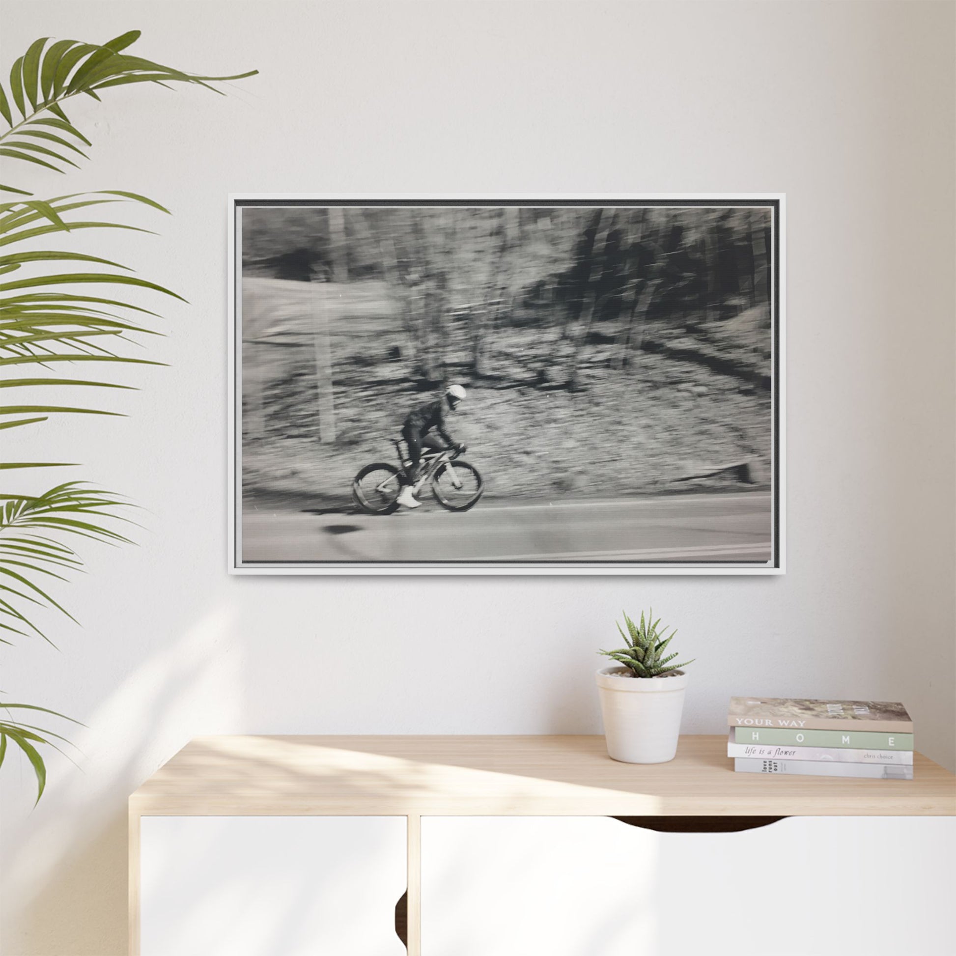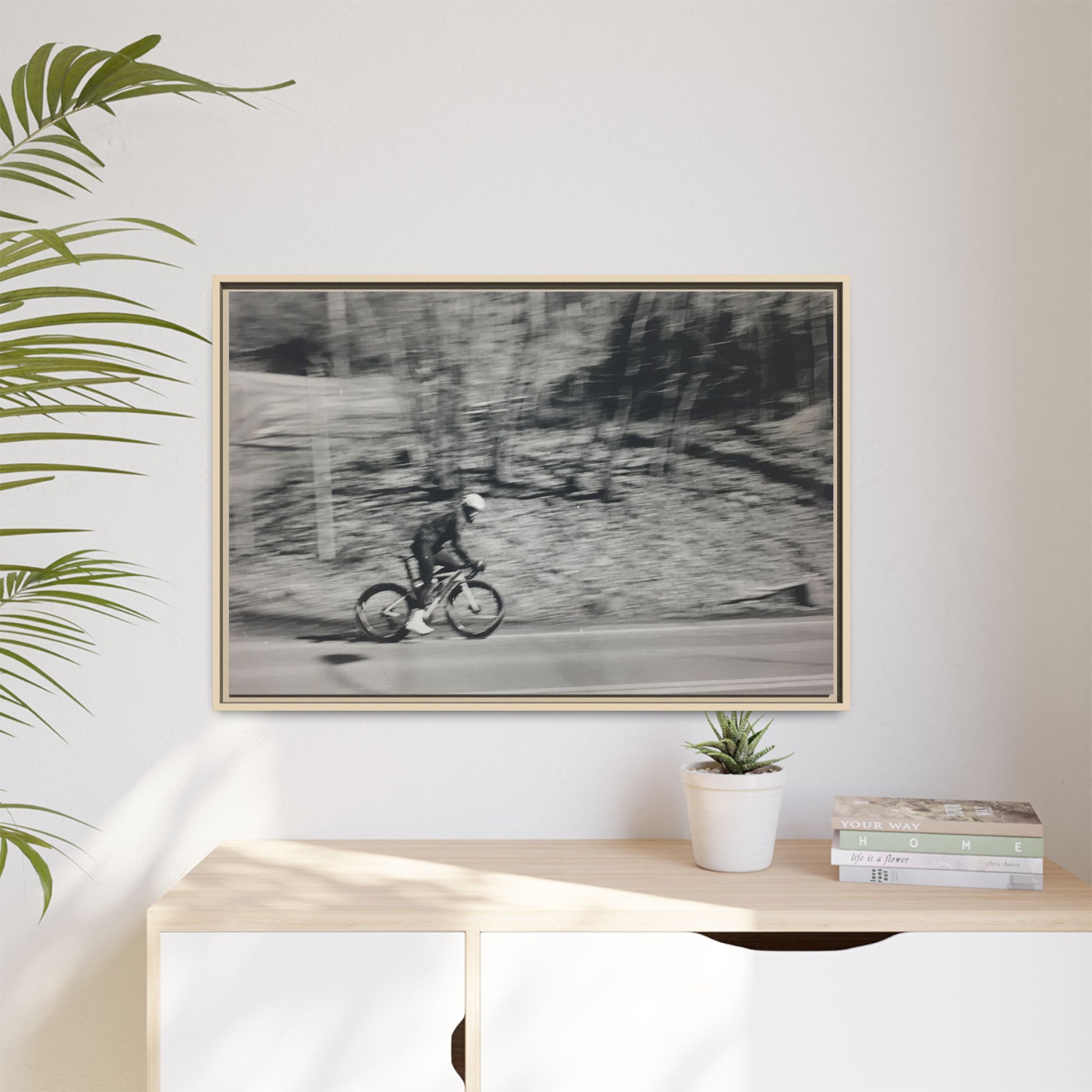 A matte canvas print framed in slim pine, rendered in muted monochrome to evoke motion and memory. The blurred cyclist and soft-grain background create a fleeting, cinematic moment—like a photograph pulled from a rainy afternoon ride. Hung in a hallway, studio, or living room, this piece brings quiet energy without shouting for attention. The narrow frame and matte finish keep glare low and colors restrained, letting texture and composition lead the eye. For those who collect moments rather than memorabilia, this canvas adds a thoughtful, contemplative layer to everyday spaces.
