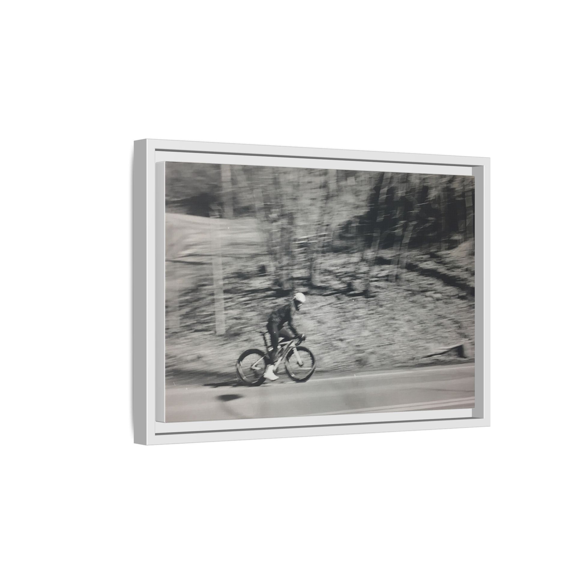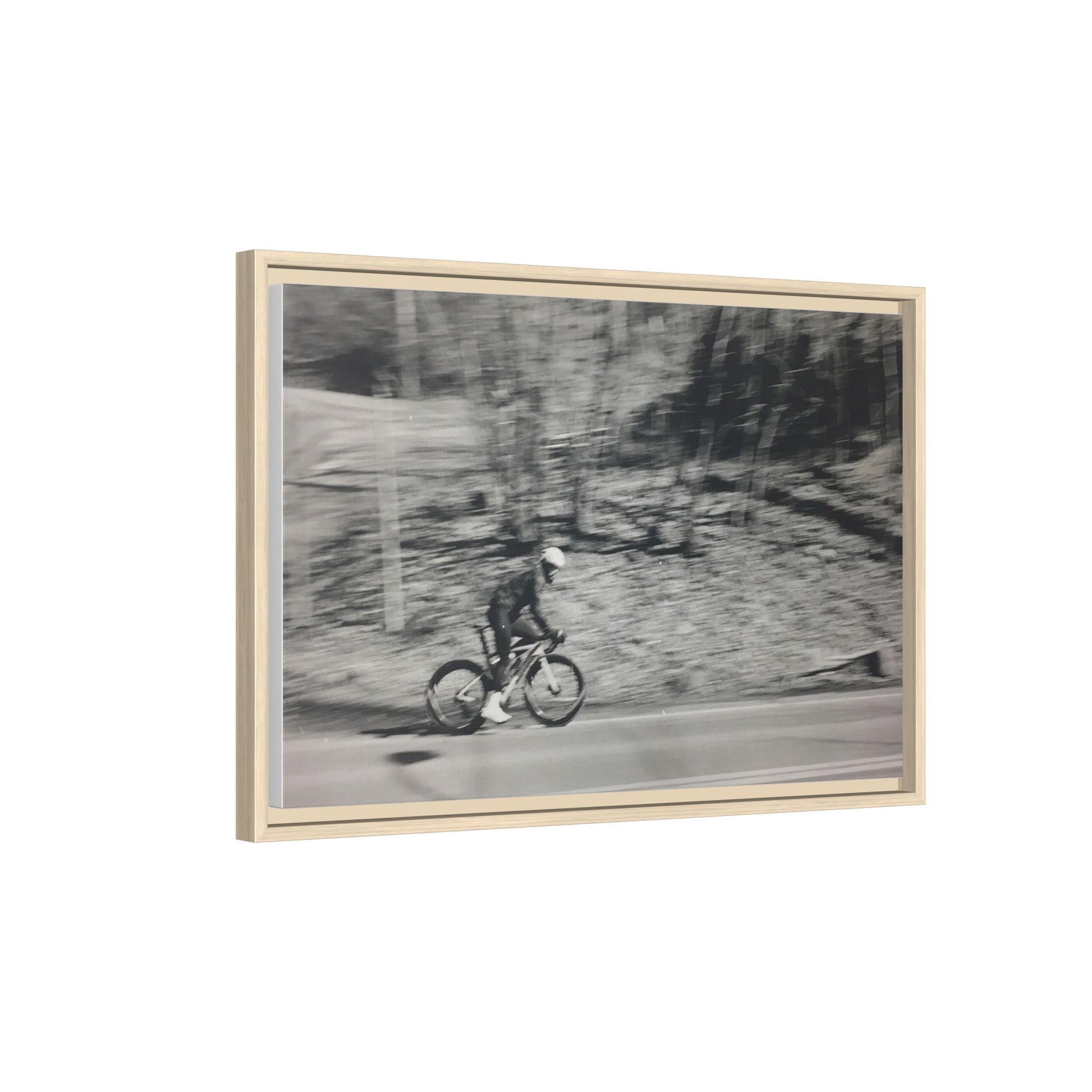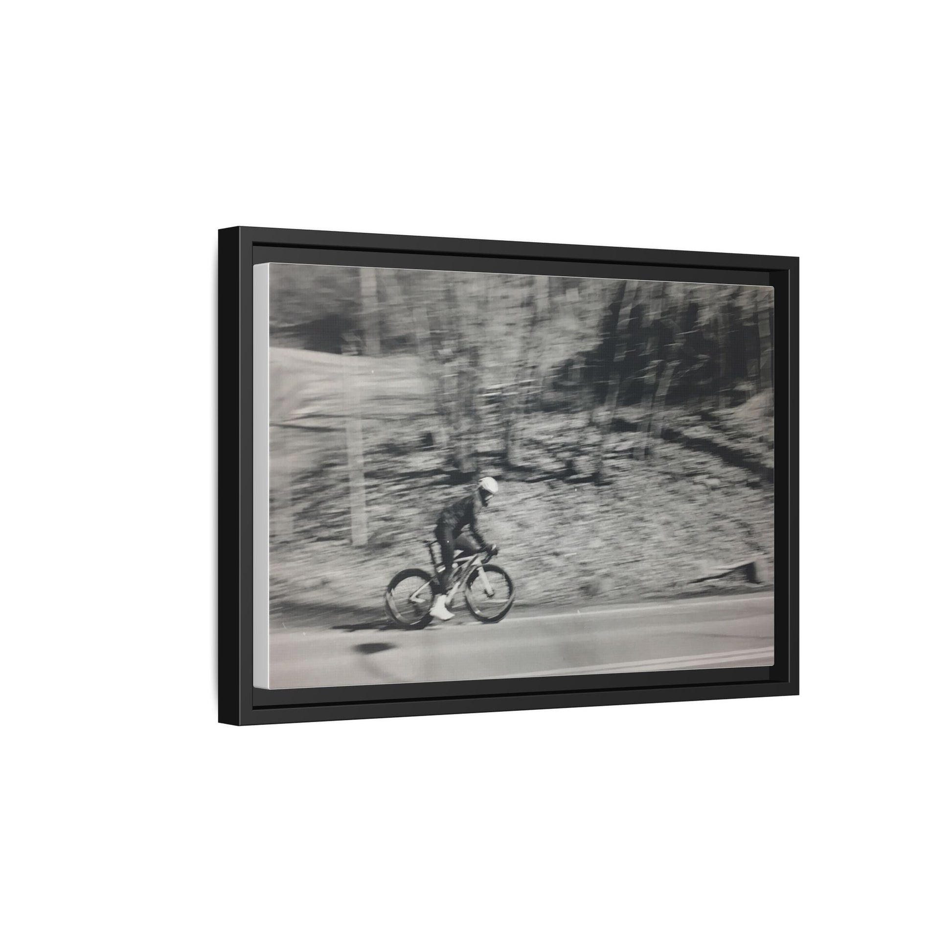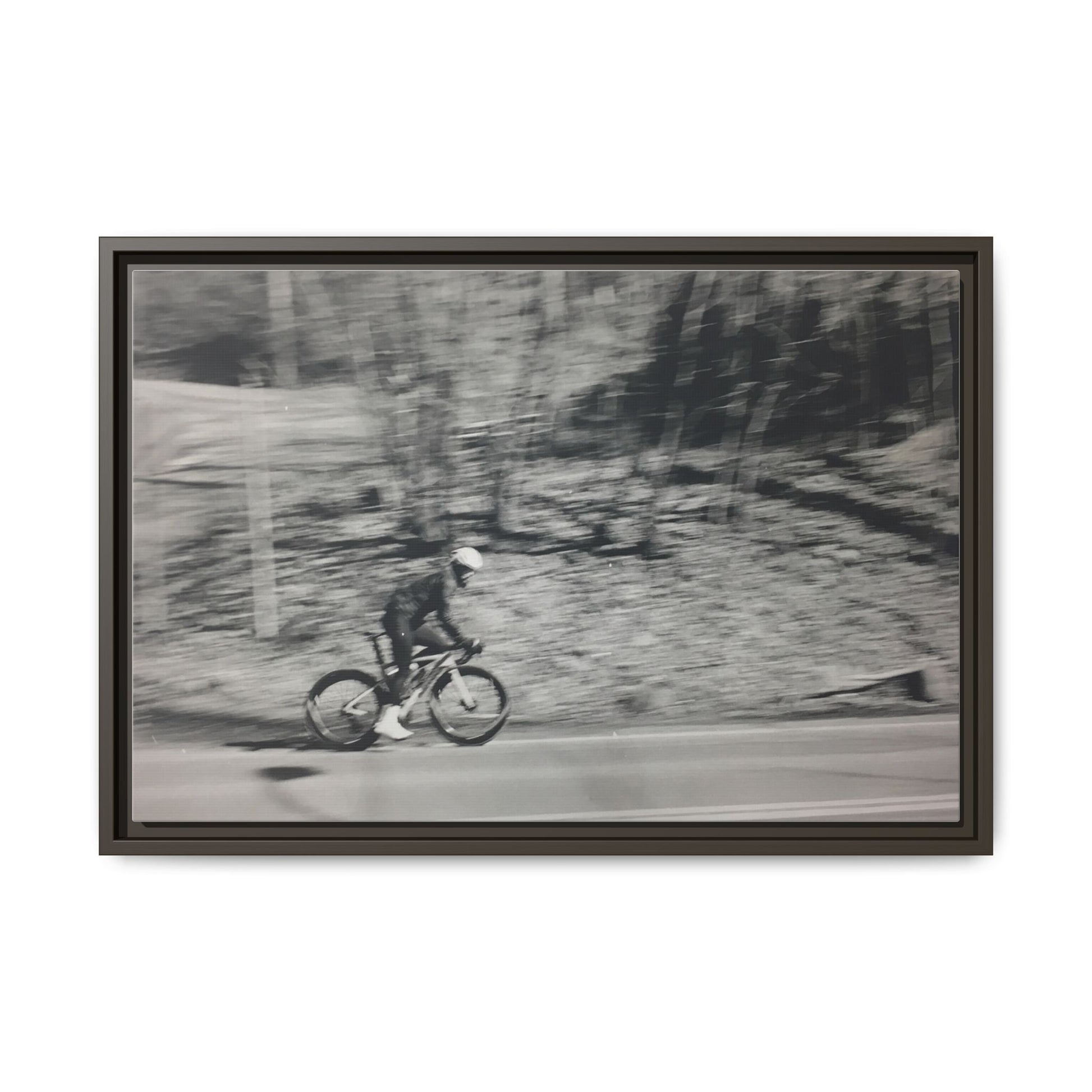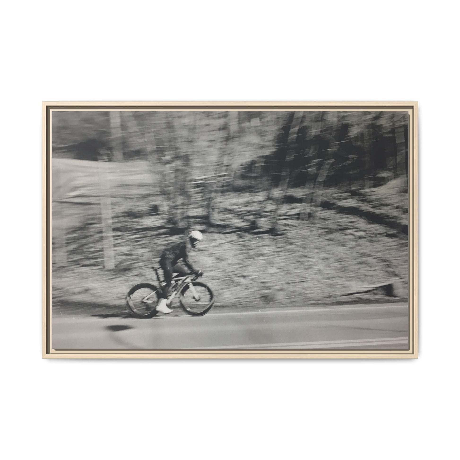 A matte canvas print framed in slim pine, rendered in muted monochrome to evoke motion and memory. The blurred cyclist and soft-grain background create a fleeting, cinematic moment—like a photograph pulled from a rainy afternoon ride. Hung in a hallway, studio, or living room, this piece brings quiet energy without shouting for attention. The narrow frame and matte finish keep glare low and colors restrained, letting texture and composition lead the eye. For those who collect moments rather than memorabilia, this canvas adds a thoughtful, contemplative layer to everyday spaces.