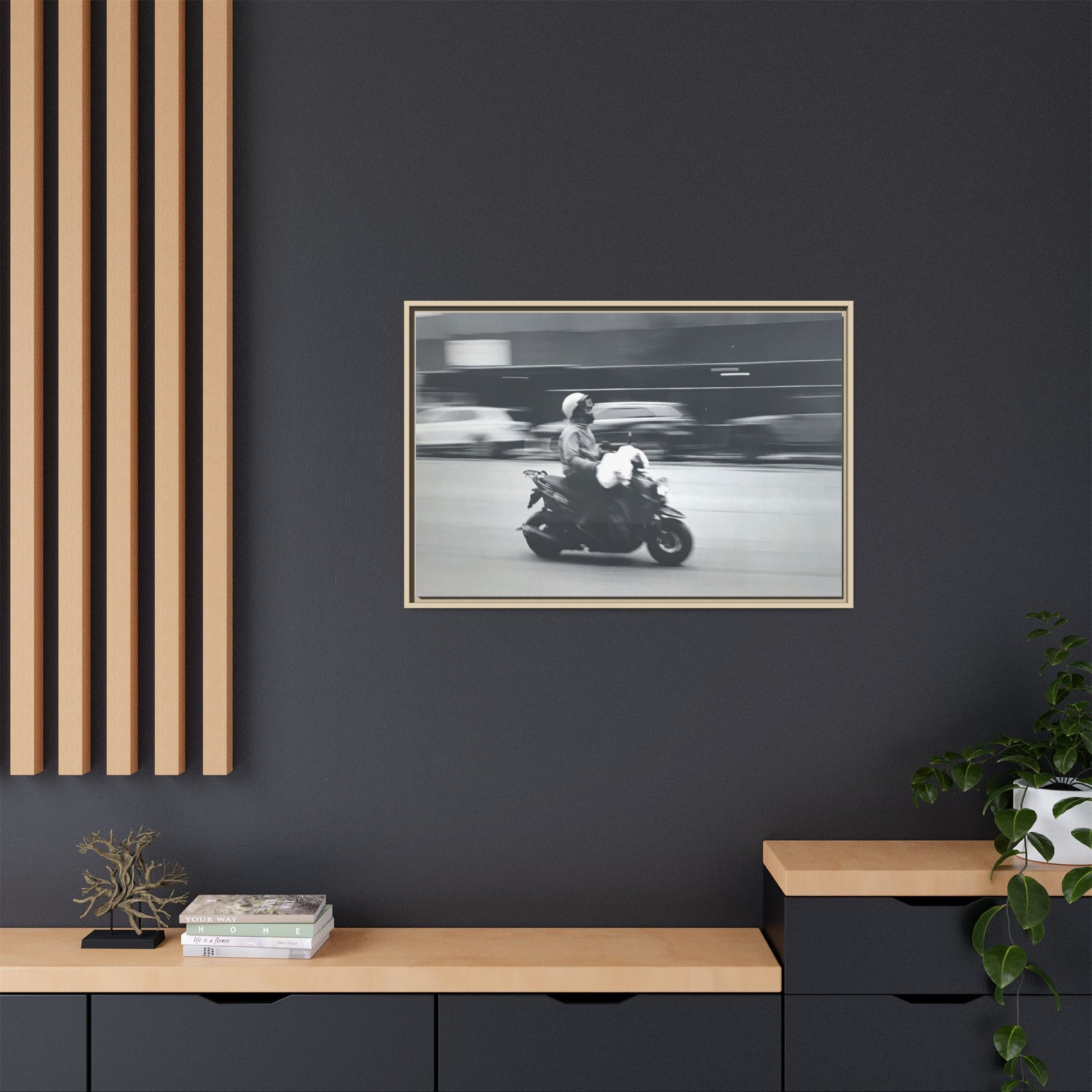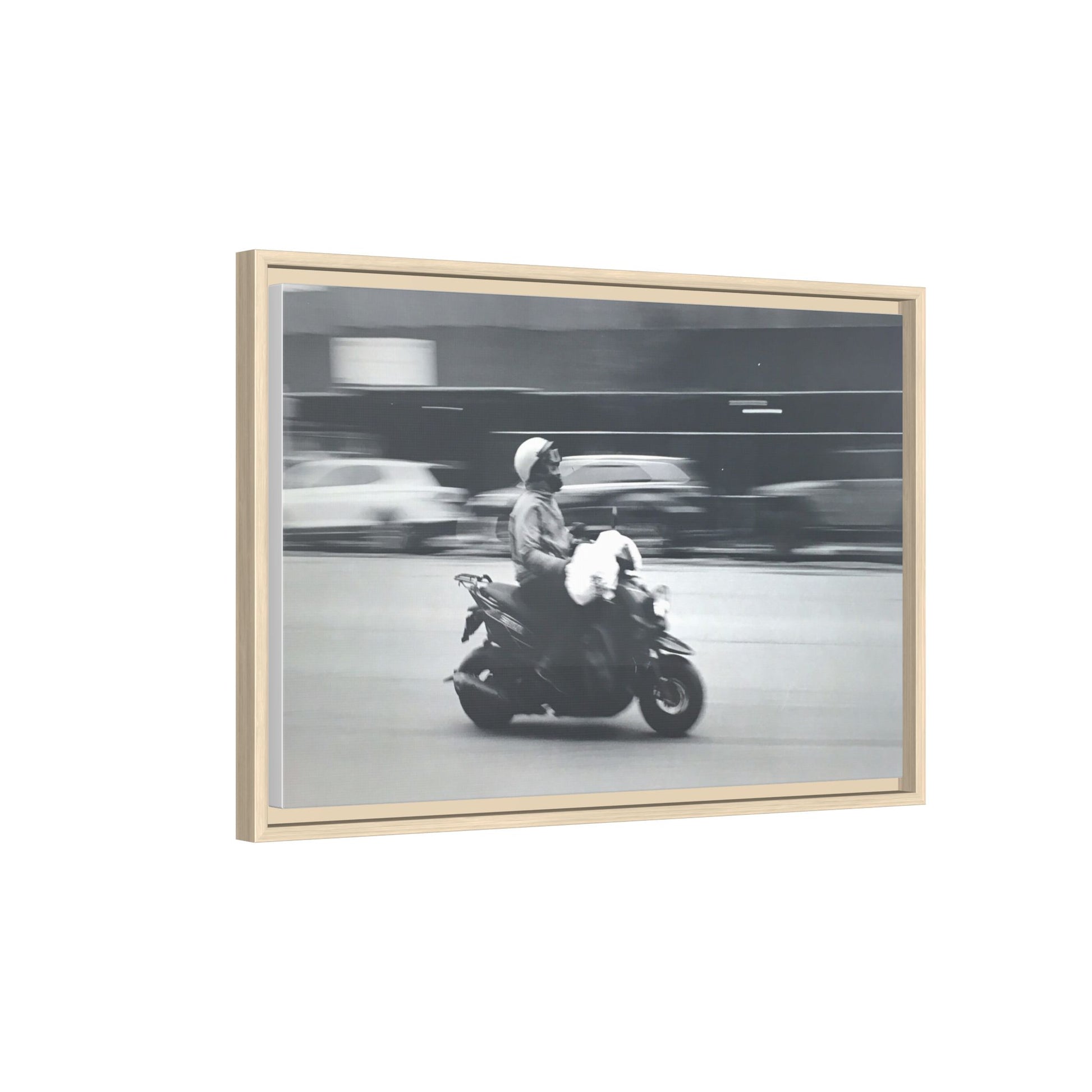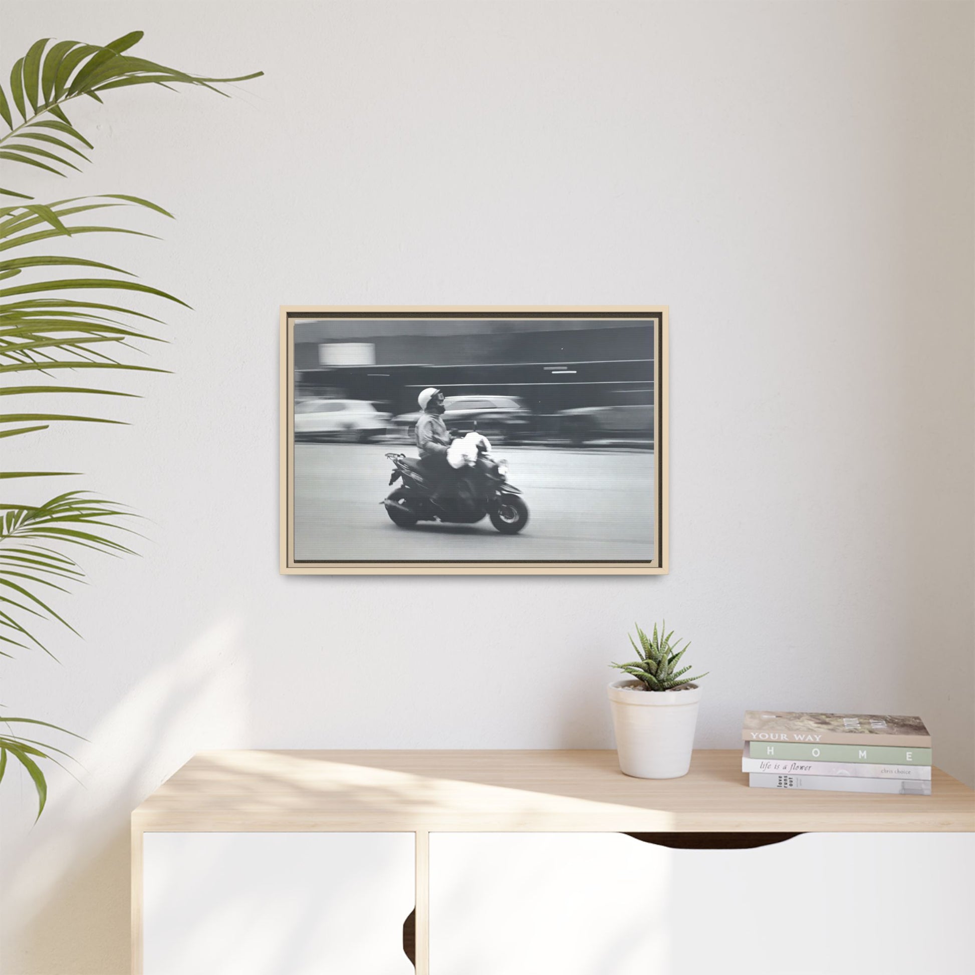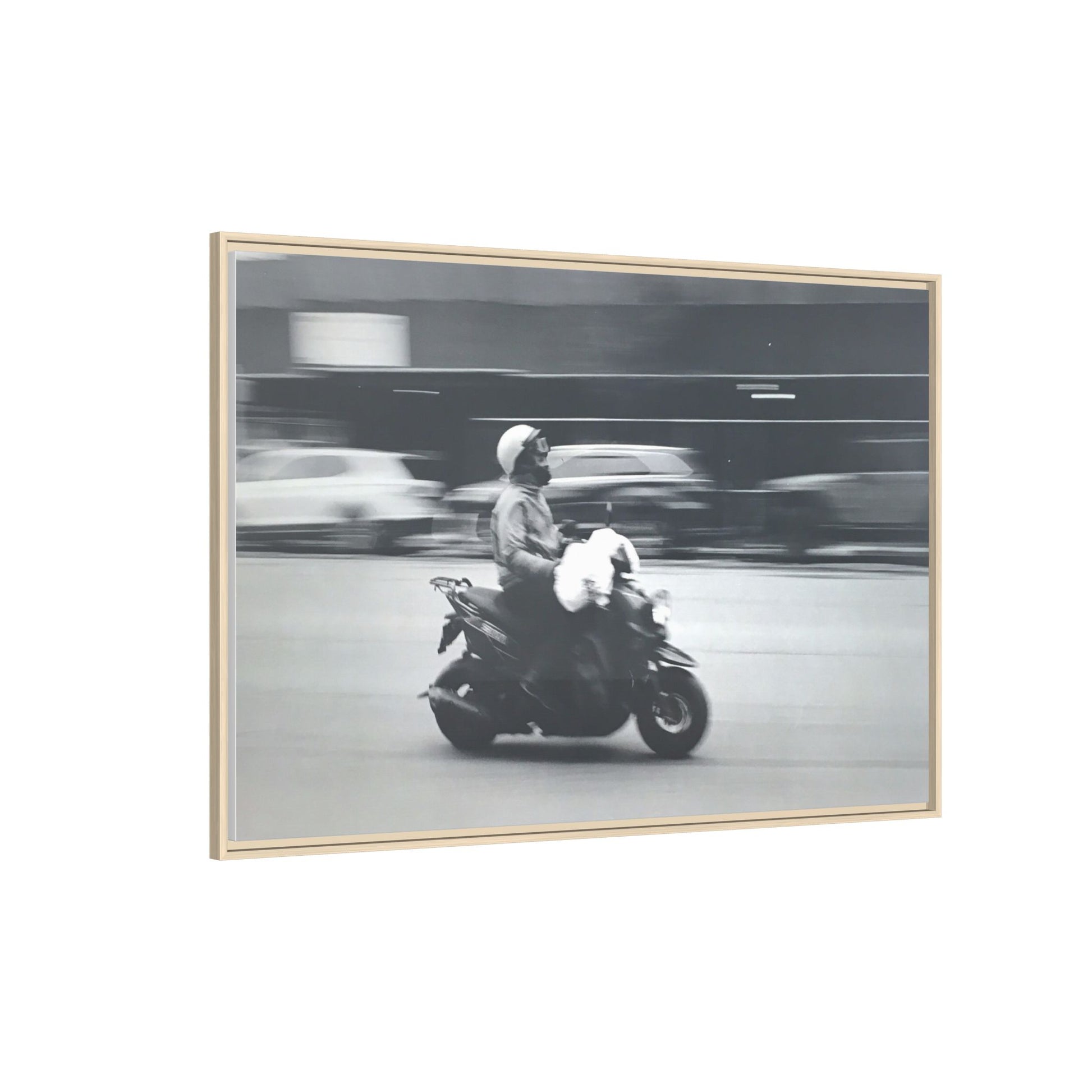 A matte canvas print framed in slim pine brings a quiet, cinematic moment into your space. The blurred black-and-white photo — a lone rider on a scooter moving through an urban street — feels like a memory pulled from a travel journal: hurried, intimate, and slightly out of focus. The muted palette and clean frame let the image set a contemplative mood without shouting for attention. Hang it over a console, in a hallway, or beside a reading nook to add an instant layer of urban nostalgia and motion to a calm interior.