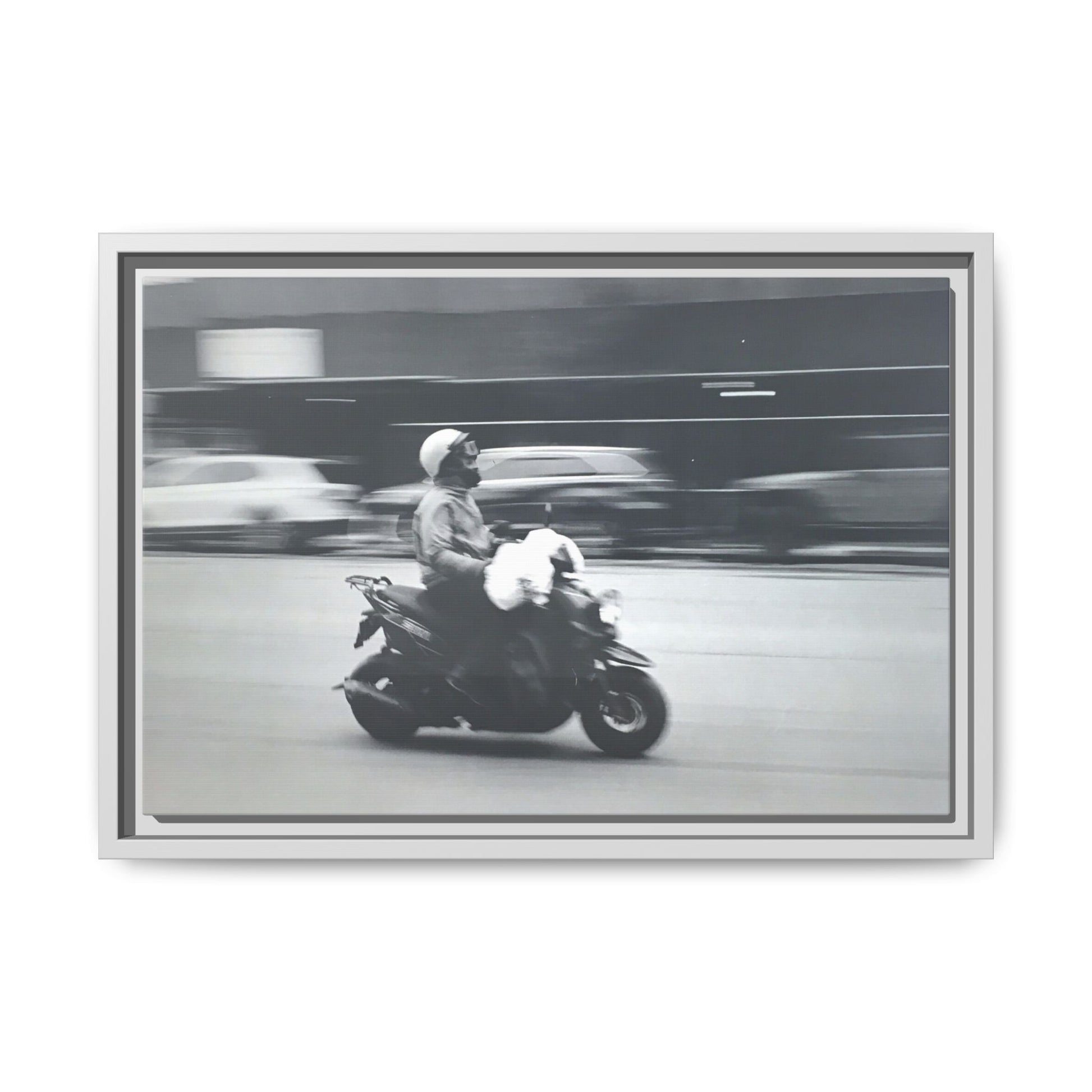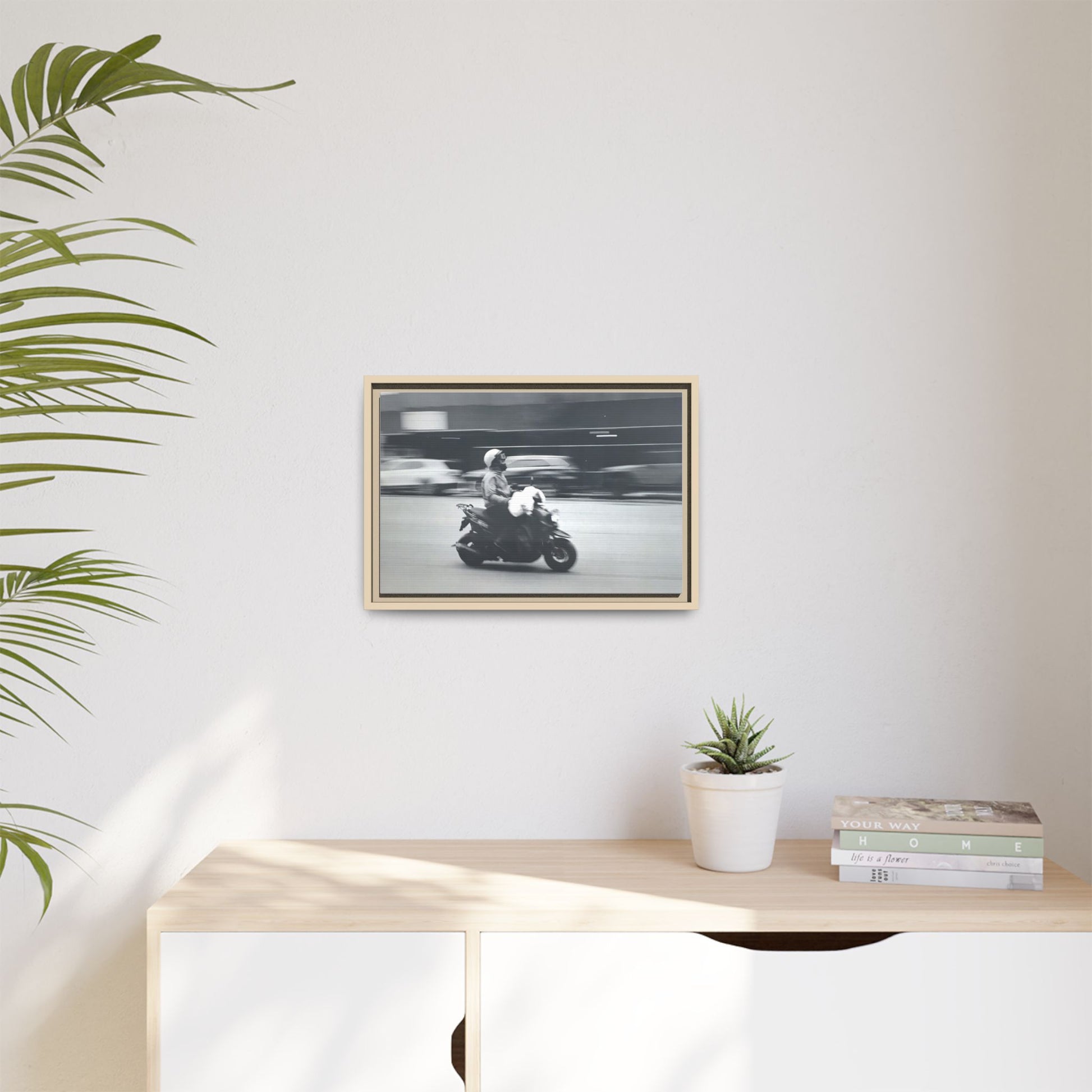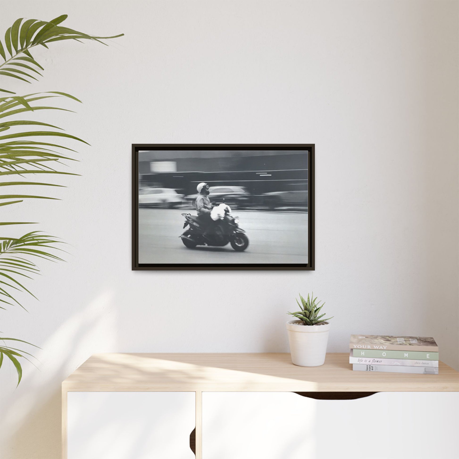 A matte canvas print framed in slim pine brings a quiet, cinematic moment into your space. The blurred black-and-white photo — a lone rider on a scooter moving through an urban street — feels like a memory pulled from a travel journal: hurried, intimate, and slightly out of focus. The muted palette and clean frame let the image set a contemplative mood without shouting for attention. Hang it over a console, in a hallway, or beside a reading nook to add an instant layer of urban nostalgia and motion to a calm interior.