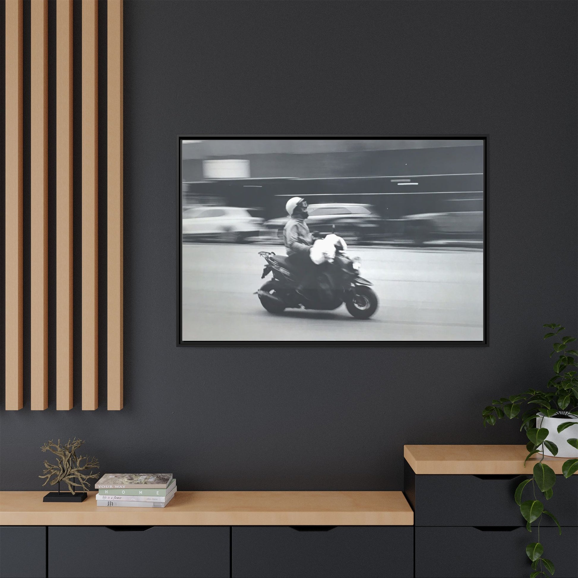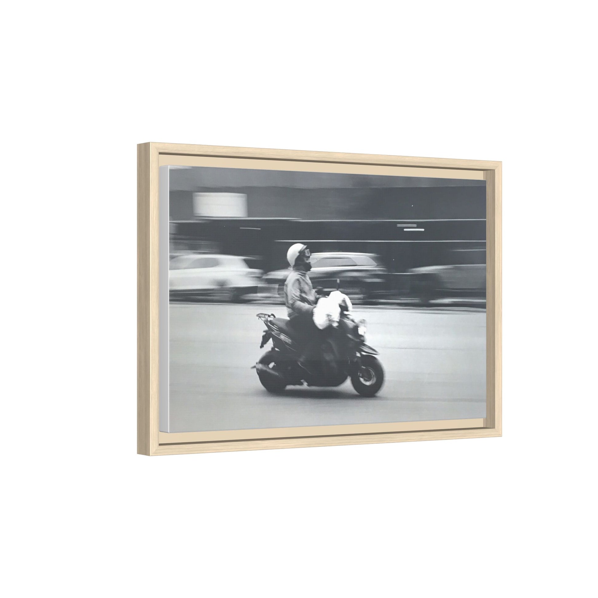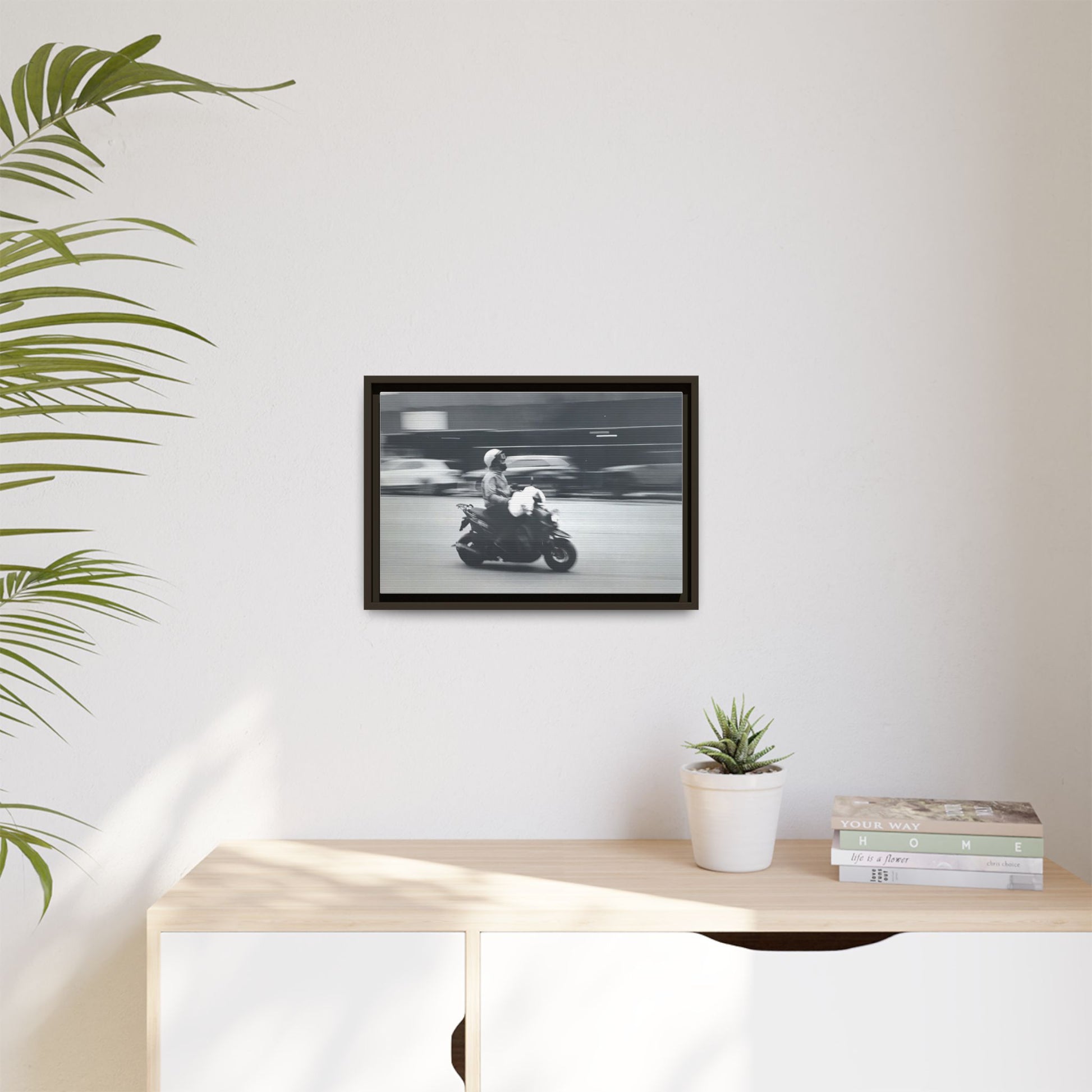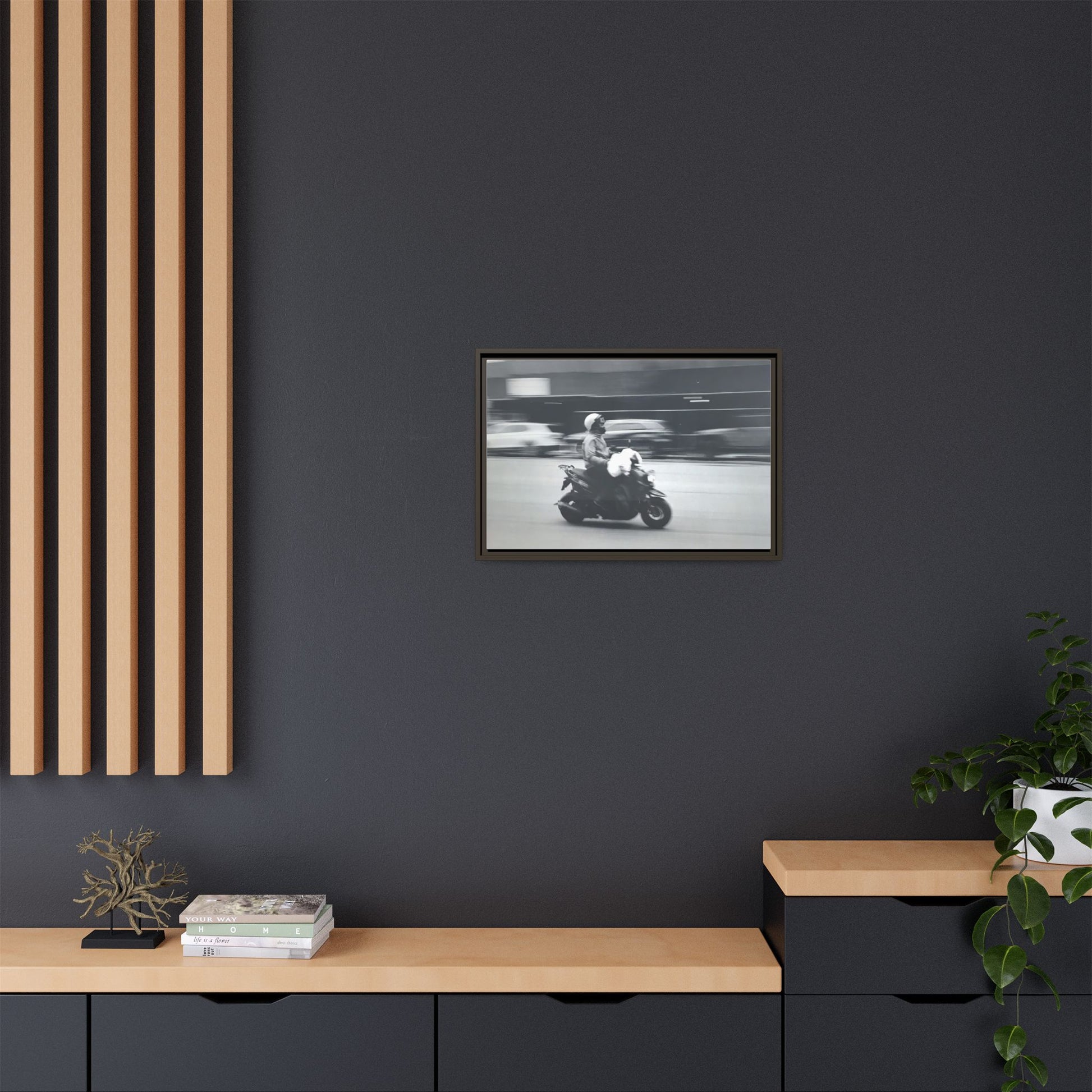 A matte canvas print framed in slim pine brings a quiet, cinematic moment into your space. The blurred black-and-white photo — a lone rider on a scooter moving through an urban street — feels like a memory pulled from a travel journal: hurried, intimate, and slightly out of focus. The muted palette and clean frame let the image set a contemplative mood without shouting for attention. Hang it over a console, in a hallway, or beside a reading nook to add an instant layer of urban nostalgia and motion to a calm interior.