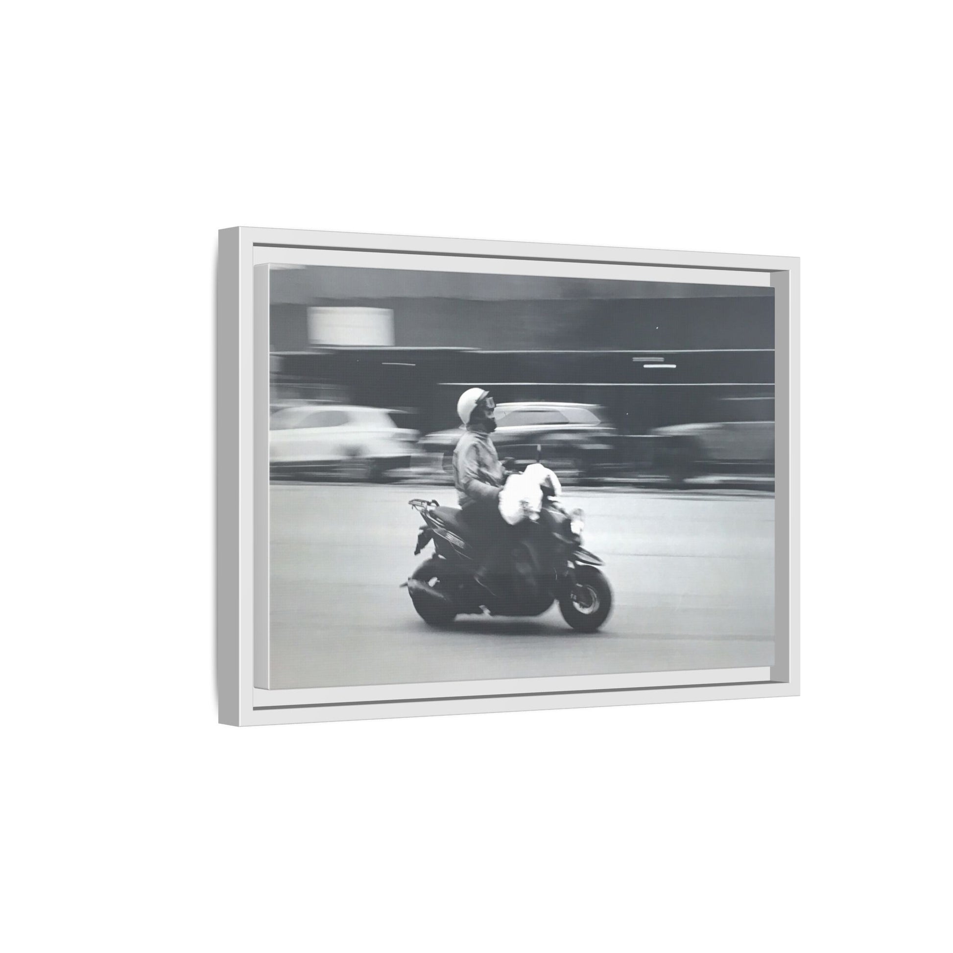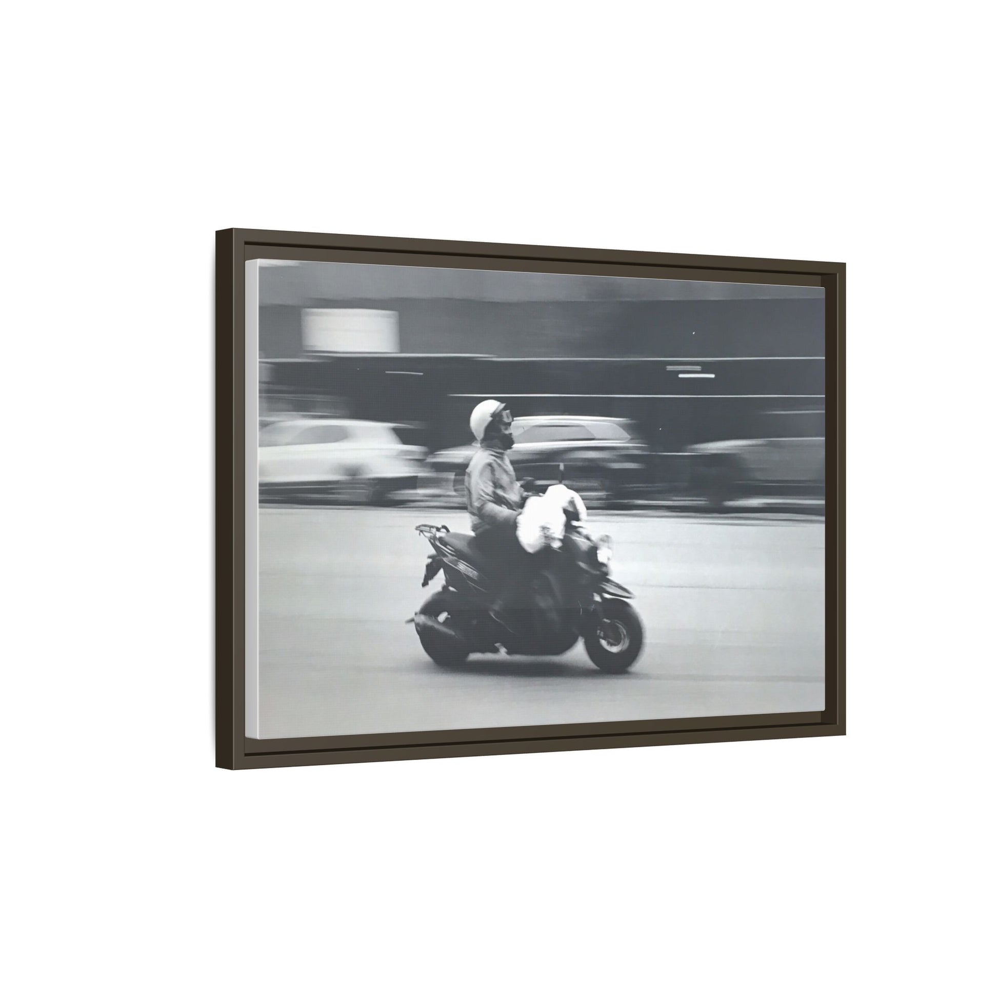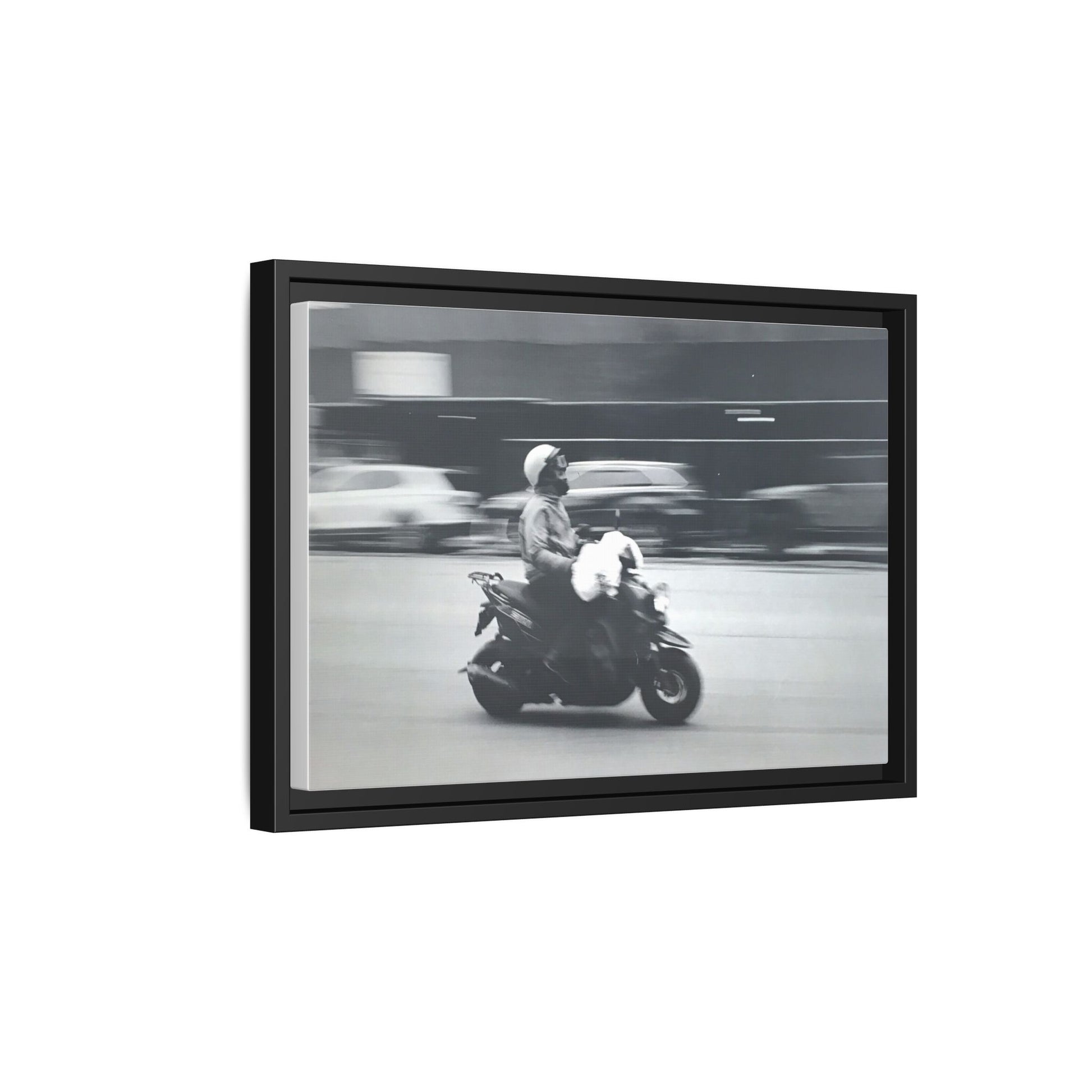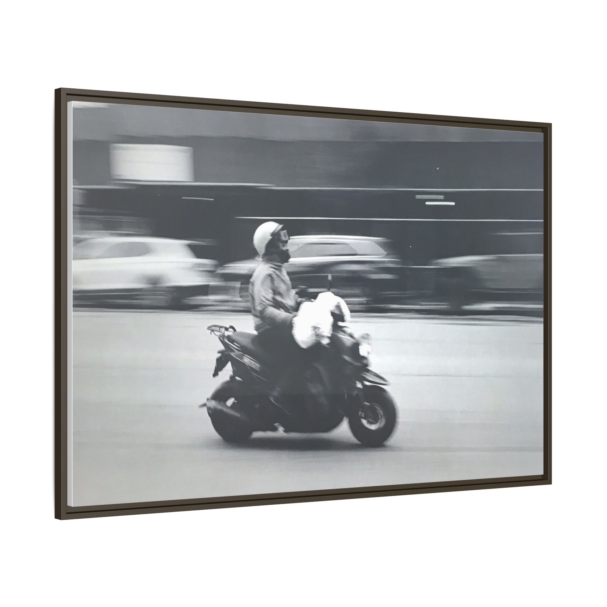 Framed Matte Canvas Print — Vintage Motion Scooter Street Photography